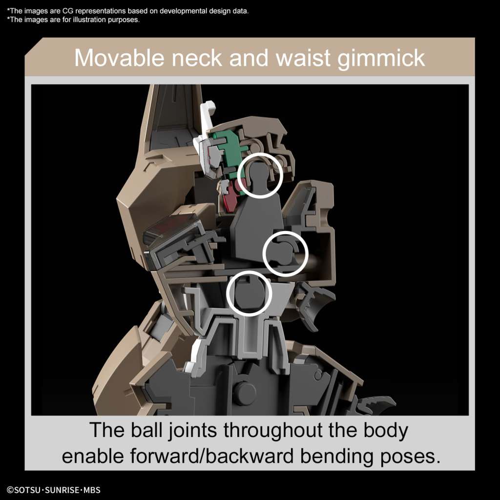 Kugelgelenke mit Strukturen, die Bewegungsfreiheit bieten, wurden im Nacken und in der Hüfte eingesetzt, um nach vorne gebeugte Posen zu ermöglichen. Der Unterarm verfügt über rotierende Abschnitte und verschiedene Abschnitte können nach dem Zusammenbau der Teile fixiert werden, um die Montage zu erleichtern.